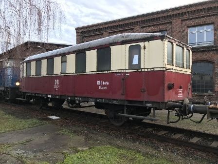 Das Fahrzeug wurde 1927 bei der Firma Wegmann als 2-achsiger Dieseltriebwagen „VT 804“ gebaut. Die damalige Deutsche Reichsbahn Gesellschaft hatte insgesamt vier Stück dieses Typs erworben, um damit einen wirtschaftlicheren Betrieb auf Nebenbahnen zu testen. Zwei Stück davon verblieben nach dem Krieg in der sowjetischen Besatzungszone. 1951 wurde der Motor unseres Fahrzeugs entfernt und die Deutsche Reichsbahn der DDR setzte ihn fortan als Beiwagen unter der Nummer VB 140 602 ein, unter anderem auf der Strecke Rövershagen – Graal-Müritz. 1960 bis 1975 kam er auf der Prignitzer Kreisringbahn zum Einsatz, bis diese stillgelegt wurde. 1977 übernahm die Rbd Berlin den Wagen und diente dort fortan als Personal- und Bauzugwagen. 1988 übergab man ihn an das Deutsche Technikmuseum Berlin, wo er im Depot für Kommunaltechnik an der Monumentenstraße abgestellt wurde. Dort war er ab und zu für die Öffentlichkeit zugänglich, zuletzt im September 2019. Da die Abstellmöglichkeiten in der Monumentenhalle inzwischen ausgeschöpft sind und sich gerade ein Kontakt zwischen unseren beiden Museen entwickelte, ergab sich die Möglichkeit eines Transfers. Da offenbar auch das Konzept des Historischen Lokschuppens Wittenberge die Verantwortlichen des Technikmuseums überzeugte, wurde eine Übergabe vereinbart. Damit ist es gelungen, das vermutlich letzte existierende Fahrzeug der Perleberger Kreisringbahn und damit ein wertvolles Stück Prignitzer Eisenbahngeschichte in die Region zurückzuholen. Wir danken dem Technikmuseum sehr herzlich dafür! Zeitungsartikel zum Fahrzeug |