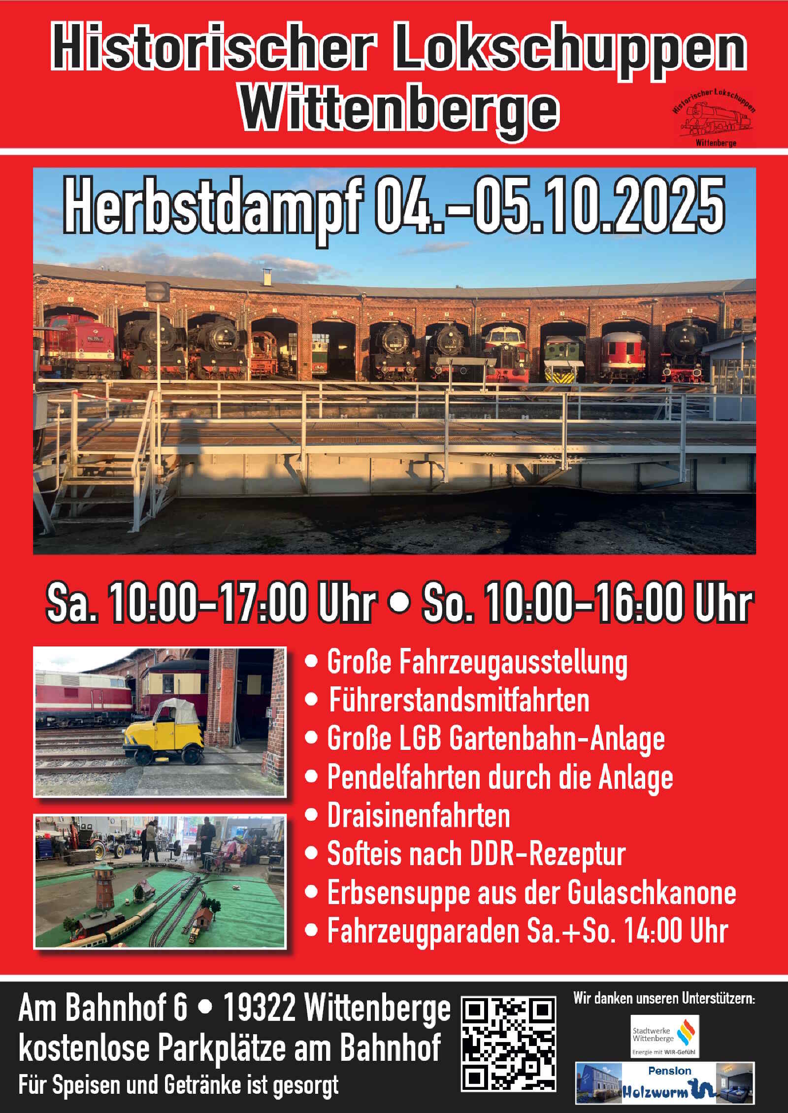 Wir freuen uns, Sie heute auf einige Veranstaltungen im September hinweisen zu dürfen. Der Tag des offenen Denkmals findet 2025 am Sonntag, 14. September, statt, und das Motto lautet: "Wert-voll: unbezahlbar oder unersetzlich". In Brandenburg werden wie in ganz Deutschland historische Gebäude und Anlagen für die Öffentlichkeit zugänglich gemacht. Wir schließen uns dieser Initiative gerne an und öffnen unser Museum außerplanmäßig auch an diesem Sonntag zwischen 10 und 14 Uhr. Das besondere an diesem Tag ist, dass der sonst übliche Eintrittspreis entfällt und Sie unser Museum kostenlos besuchen können. Wir freuen uns natürlich über Spenden, weil der Betrieb des Museums auch an diesem Tag Geld kostet. Eine Liste aller sonst in der Gegend geöffneten Denkmäler finden Sie auf der Internetseite der Deutschen Stiftung Denkmalschutz https://www.tag-des-offenen-denkmals.de/programm . Hier gibt es eine Suchfunktion. Wenn Sie unter der Rubrik "Programm" als Ort "Landkreis" und im Feld für den Ort "Prignitz" eingeben, finden Sie auch etliche andere interessante Orte, deren Besuch Sie gut mit einem Besuch bei uns kombinieren können. Am Samstag, den 20. September, wird zudem bundesweit der "Tag der Schiene" begangen, an dem viele Eisenbahnunternehmen und -museen ihre Arbeit vorstellen. So werden auch wir an diesem Tag zwischen 10 und 16 Uhr für Sie zur Verfügung stehen. Ab 17 Uhr findet ein Konzert im Lokschuppen statt, das Ihnen klassische Musik in Form von Werken von Händel, Haydn und Mozart kredenzt. Zum ersten Mal wird in diesem Rahmen die besondere Kulisse des Lokschuppens auch für einen Programmbeitrag der Ballettgruppe der Kreismusikschule genutzt. Konzerte wie dieses finden bereits seit ein paar Jahren im Rahmen der Veranstaltungsreihe Klanglandschaft Prignitz statt und hat bereits eine eigene Fangemeinde, weil die klassische Musik in Kombination mit unserer einmaligen Atmosphäre ihren ganz besonderen Reiz hat. Der Eintritt für das Konzert kostet 14 Euro, ermäßigt 9 Euro (Schüler, Studenten, Leistungsempfänger). Nähere Informationen finden Sie auch unter https://www.klanglandschaft-prignitz.de . Und wo wir schon über Termine sprechen: Am ersten Oktober-Wochenende findet unsere Veranstaltung Herbstdampf statt. Am 4. und 5. Oktober lassen wir wieder die Herzen aller großen und kleinen Eisenbahnfans höherschlagen, wenn unsere historischen Fahrzeuge wieder in Aktion zu sehen sind. Nähere Informationen wird es bald an dieser Stelle geben.