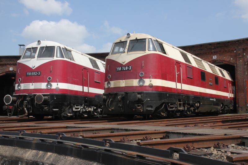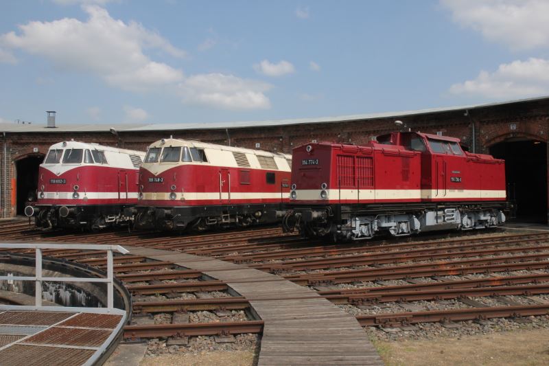 Am 12.05.2018 besuchte eine Reisegruppe des Bundes der Deutschen Eisenbahnfreunde (BDEF) mit einer etwa 70 Personen umfassenden Reisegruppe unser Museum. Standesgemäß reiste die Gruppe von Berlin aus mit einem eigenen Sonderzug an, der von einer Diesellok der Baureihe 118 gezogen wurde. Leider erlaubte es das für den Sonderzug zuständige Eisenbahnverkehrsunternehmen nicht, dass der Zug im Museumsgelände abgestellt und sich die Lok zu ihren Schwestern gesellen durfte. Das tat der Stimmung allerdings keinen Abbruch und so sonnten sich die Dieselloks des Museums vor dem Lokschuppen. Neben unseren Großdieselloks der Baureihe 118 und 114 hatten wir fotogerecht auch unsere Kleinloks aufgestellt.